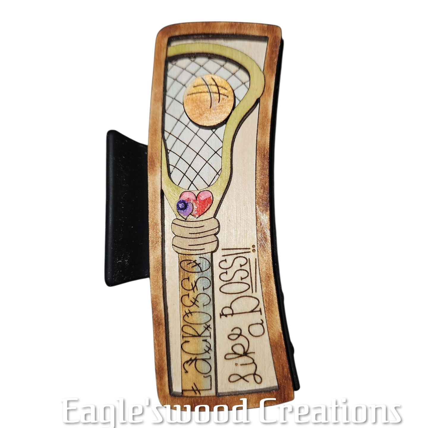 Own the field with this bold lacrosse hairclip that says you mean business! This confident 4.1 accessory rocks a striking lacrosse design for players who play hard and style harder. Keep your hair in check while commanding attention with your fierce passion for the sport. Perfect for game day, practice sessions, or anytime you want to show the world you're a lacrosse force to be reckoned with. This playful yet powerful hairclip is your go-to accessory for athletes who refuse to compromise on attitude or appearance.