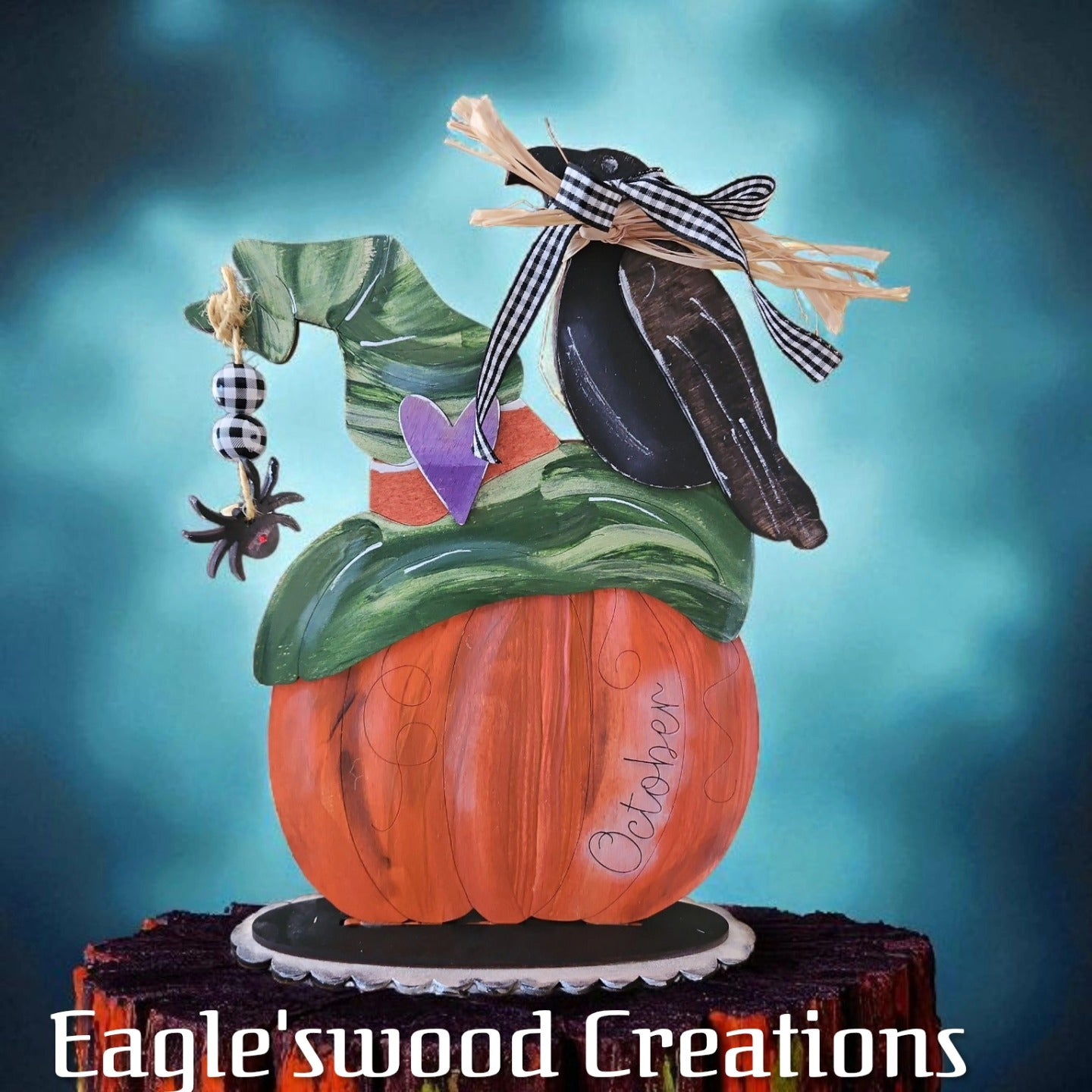 Add a touch of spooky charm to your shelf with this playful raven perched next to a pumpkin wearing a whimsical witch hat. Dangling spiders add a fun, eerie detail perfect for Halloween decor. This cheerful combination brings festive spirit and a bit of mischief to any room.